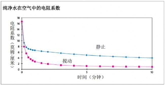 正常的實驗室使用中,水由 PURELAB flex 等凈水器分配到容器中。 數秒之內,水開始吸收空氣中的二氧化碳, 生成碳酸, 從而將水的電阻率從 18.2 Mohm.cm 降到最低大約 1.3 Mohm.cm, 如圖 4 所示。 酸里的氫離子具有高導電性,使這一巨大變化在二氧化碳濃度僅為 0.5 毫克/升時得以實現。雖然二氧化碳在多數應用中不降低水的等級,但它對電阻系數的影響可能掩蓋其他離子對水的污染。