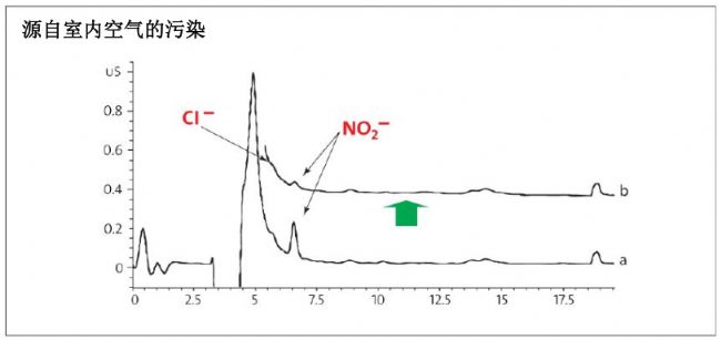 由于空氣中的雜質也能降低水的純度,分配 Type 1 超純水時還務必減少空氣夾帶。圖 6(參考資料 C)比較空氣對噴灑采集的(低痕量 a)水樣與流過容器壁采集的(高痕量 b)水樣的污染情況。離子色譜分析清楚表明, 噴灑時檢測到的陰離子特別是亞硝酸離子濃度較高。