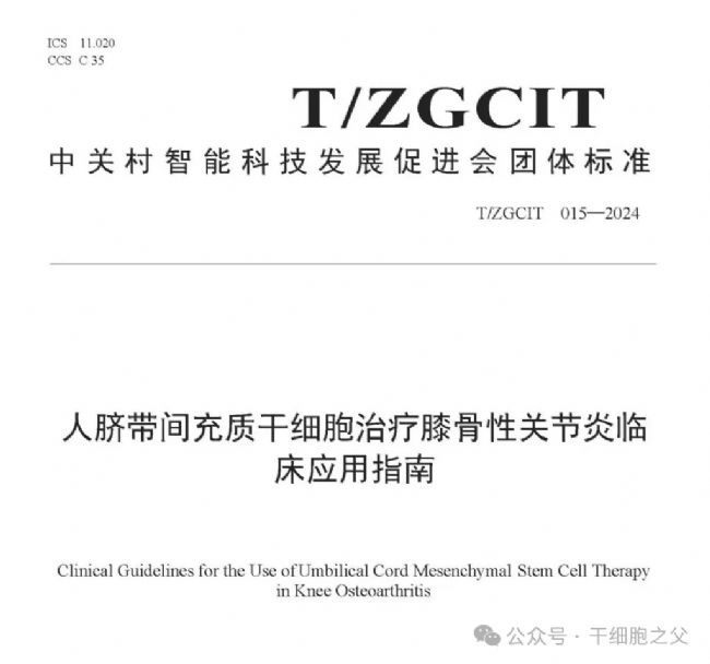 2024年12月30日,中關(guān)村智能科技發(fā)展促進(jìn)會(huì)正式發(fā)布了團(tuán)體標(biāo)準(zhǔn)T/ZGCIT 015—2024《人臍帶間充質(zhì)干細(xì)胞治療膝骨性關(guān)節(jié)炎臨床應(yīng)用指南》以下簡(jiǎn)稱《指南》)。這一舉措標(biāo)志著我國(guó)在利用前沿生物科技手段治療退行性關(guān)節(jié)疾病領(lǐng)域邁出了堅(jiān)實(shí)的一步。