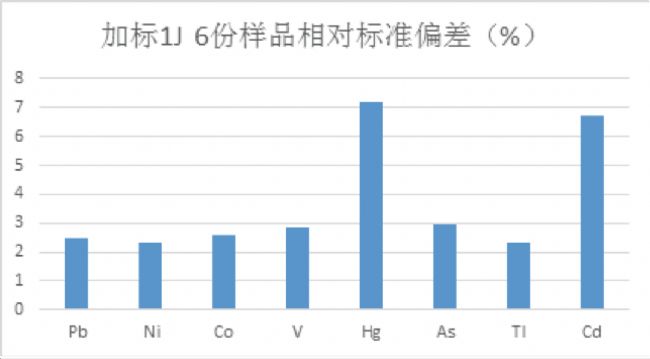 平行取6份樣品,加入1J計算相對標準偏差,本實驗選取鹽水樣品,根據(jù)方法準則的要求,其偏差需控制在20%以內(nèi)。