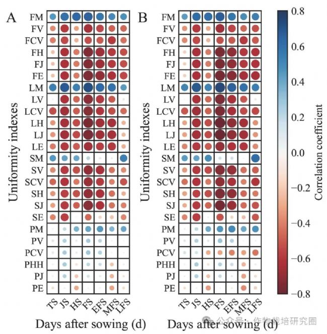 由于均勻度指數(shù)的變化趨勢相似,因此很難確定哪一個最適合使用。因此,研究對均勻度指數(shù)與產(chǎn)量和生物量之間的相關(guān)性進(jìn)行了分析(圖2)。并分別篩選了4個農(nóng)藝參數(shù)與產(chǎn)量和生物量相關(guān)性最高的均勻度指數(shù)(FE, LJ, SJ, PM),其中,開花期(FS)的LJ與產(chǎn)量(r=-0.760)和生物量(-0.801)相關(guān)性最高。
