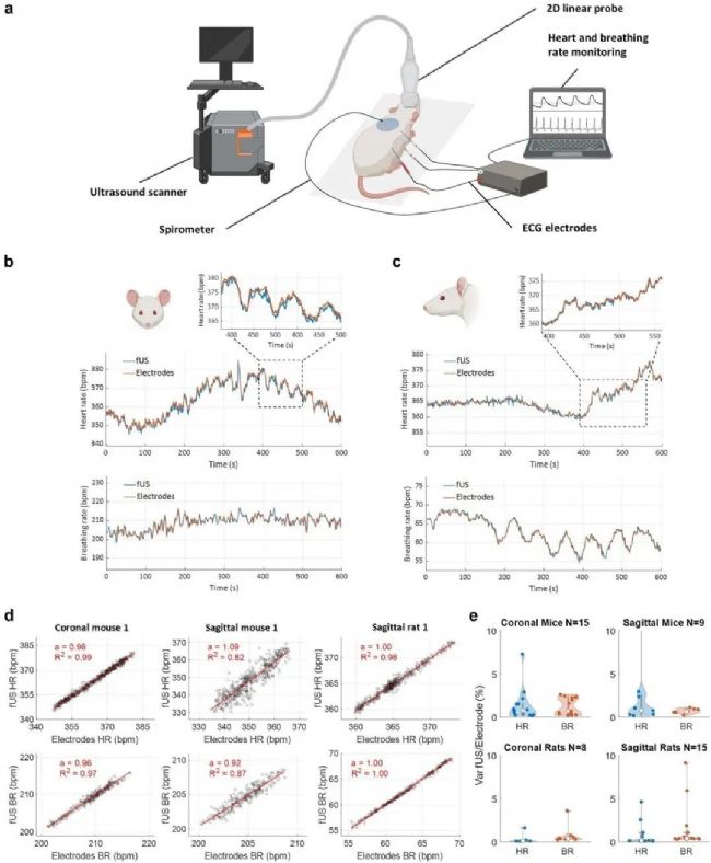 圖3:fUS 與電極的同步表明其在麻醉嚙齒動物中可實現(xiàn)精準且可靠的心率與呼吸頻率監(jiān)測