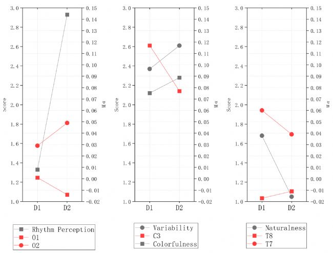 圖7 設計 D1 和 D2 中電極的 α 值與主觀因素得分的比較