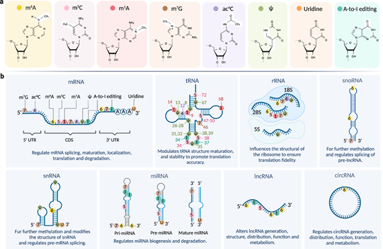 表觀轉(zhuǎn)錄組(Epitranscriptome)指RNA分子上所有可逆化學(xué)修飾的集合,這些修飾不改變RNA序列,但可以通過調(diào)控基因表達(如翻譯、降解、剪接等)發(fā)揮作用。RNA修飾廣泛存在于各種RNA類型中,包括mRNA、tRNA、rRNA、snRNA、snoRNA、miRNA、siRNA、piRNA和lncRNA等。目前已知的 RNA修飾超過150種,常見類型包括甲基化(如m6A、m5C)、羥基化、假尿苷化(Ψ)等。其中RNA甲基化是最常見的修飾類型之一,在mRNA、tRNA等分子中占比較高(如哺乳動物 mRNA 中 m6A 修飾可占甲基化修飾的 80% 以上)。