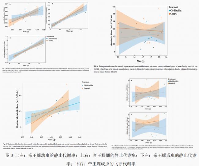 實(shí)驗(yàn)結(jié)果顯示,噻蟲胺暴露對(duì)帝王蝶的靜止代謝率沒有顯著影響,但在成蟲階段,噻蟲胺暴露顯著降低了飛行代謝率,尤其是在雄性中更為明顯。具體而言,噻蟲胺暴露的成蟲在飛行時(shí)的二氧化碳排放量顯著低于對(duì)照組,且這種影響在雄性中更為顯著(P值<0.006)。此外,實(shí)驗(yàn)還發(fā)現(xiàn),噻蟲胺暴露的幼蟲從孵化到蛹化的時(shí)間顯著縮短,但蛹化到成蟲羽化的時(shí)間沒有顯著差異。