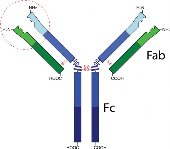 在抗體結(jié)構(gòu)研究的基礎(chǔ)上,人們發(fā)現(xiàn) IgG 可變區(qū)有兩個(gè)可以與抗原結(jié)合的區(qū)域,因此標(biāo)記可以在恒定區(qū)進(jìn)行。FITC 直接標(biāo)記在抗 IgG 分子的 Fc 片段(恒定區(qū)),即直接法,這種方法使得抗體可以直接與組織或細(xì)胞中的抗原發(fā)生反應(yīng),也被稱為一步標(biāo)記,至今仍在某些領(lǐng)域被使用。