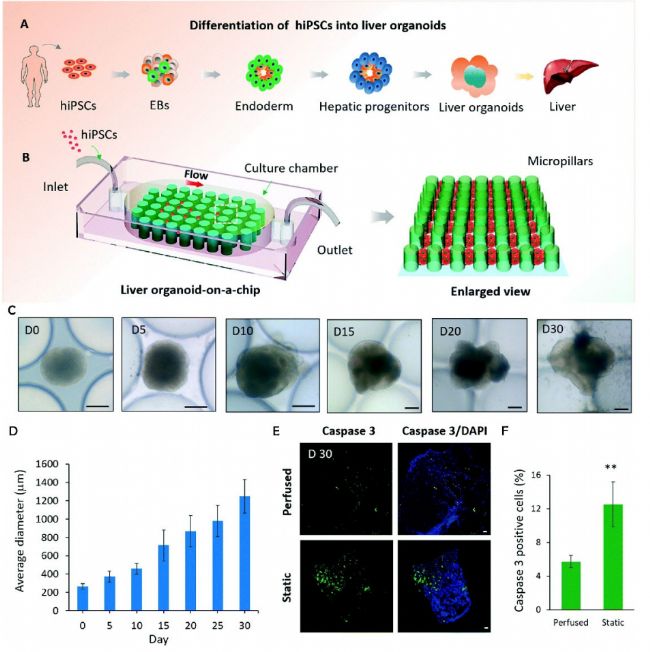 圖3. 使用簡易三維灌注芯片系統(tǒng)實(shí)現(xiàn)hiPSCs原位生成肝臟類器官的示意圖及芯片系統(tǒng)中hiPSCs分化為肝臟類器官的特征分析。