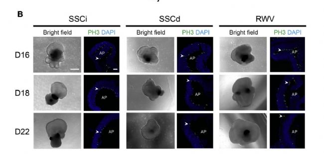 圖 4. 不同培養(yǎng)條件下類器官的生長情況。SSCi:完整類器官靜態(tài)懸浮培養(yǎng);SSCd:分離的神經(jīng)視網(wǎng)膜靜態(tài)懸浮培養(yǎng);RWV:分離的神經(jīng)視網(wǎng)膜旋轉(zhuǎn)壁式生物反應(yīng)器培養(yǎng)。