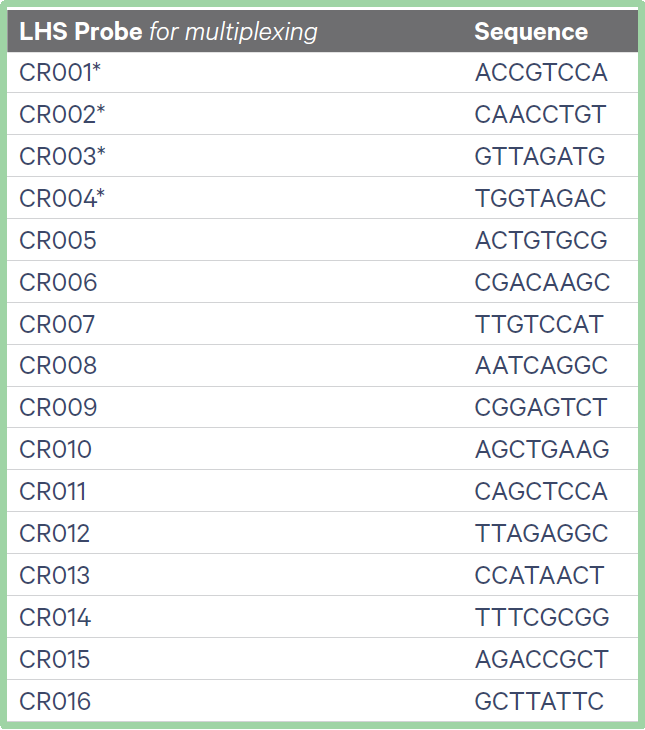 在多樣本混樣實(shí)驗(yàn)中,每個(gè)左側(cè)探針(LHS Probe)必須帶有唯一的 8 堿基探針條形碼(CR001-CR016;序列詳見(jiàn)表 2),且每個(gè)雜交反應(yīng)的 CRISPR 探針和全轉(zhuǎn)錄組擴(kuò)增(WTA)探針均需使用唯一的探針條形碼對(duì),即同一 CRISPR 探針條形碼不得與多個(gè) WTA 探針條形碼搭配使用。在單重實(shí)驗(yàn)中,可省略該探針條形碼。