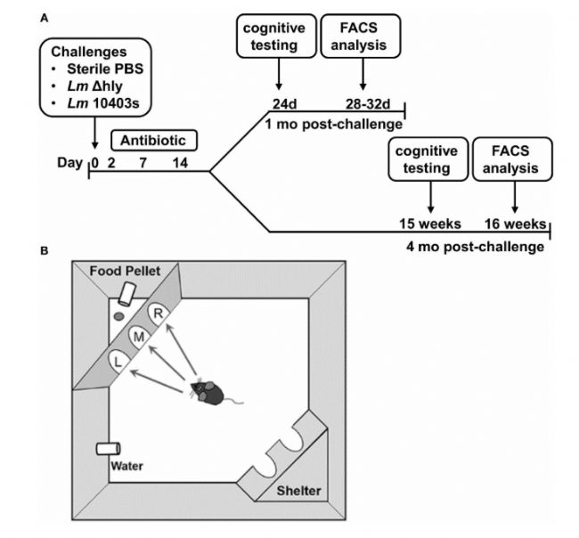 Lm是一種具有神經(jīng)侵襲性的細菌病原體,常被用于研究先天性和適應性免疫對中樞神經(jīng)系統(tǒng)感染的反應。然而,關于Lm感染后神經(jīng)認知后遺癥的數(shù)據(jù)缺乏。本文提供的數(shù)據(jù)表明,從Lm感染中恢復的小鼠在神經(jīng)認知功能的多個測量指標上存在缺陷。