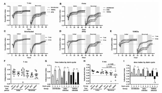 在感染后1個月時,各組在初始階段和反轉(zhuǎn)階段的差異相對較。▓D2A)。然而,到感染后4個月時,感染10403s的小鼠明顯與其他組不同(圖2B)。當直接比較每個治療組感染后1個月和4個月的結(jié)果時,性能差異更加明顯。這表明未感染小鼠在1個月和4個月時的累積學習指數(shù)相互重疊,而對于感染Δhly Lm的小鼠,觀察到較小的差異(圖2C,D)。相比之下,從Lm 10403s感染中恢復的小鼠在1個月和4個月時的指數(shù)出現(xiàn)分歧,尤其是在反轉(zhuǎn)階段(圖2E)。與未感染的對照組相比,感染Lm會損害反轉(zhuǎn)階段的認知能力(圖2F,H)。