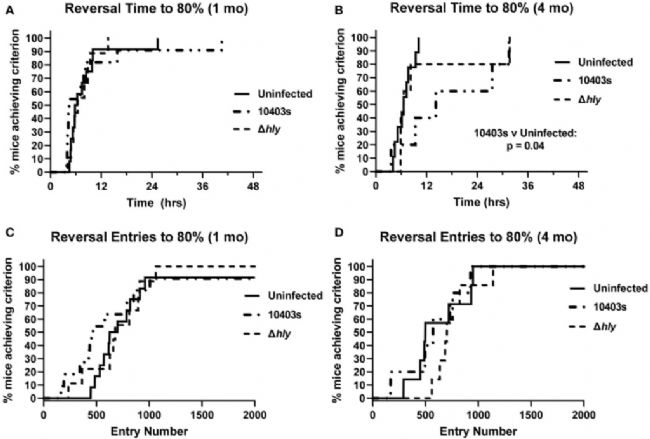 測量動物通過認知墻做出正確選擇的次數(shù),以及達到預先設定的成功標準所需的時間,特別是正確選擇的百分比。選擇的進入標準要求動物成功學習每項任務,基于在過去30次進入中達到80%的成功率。圖3所示結(jié)果表明,在反轉(zhuǎn)階段,感染10403s的小鼠在感染后4個月達到80%標準所需的時間明顯多于未感染小鼠(圖3B),而在感染后1個月時則沒有差異(圖3A)。盡管感染10403s的小鼠在4個月時需要更多時間才能達到標準(圖3D),但執(zhí)行的進入次數(shù)沒有差異(圖3C,D)。