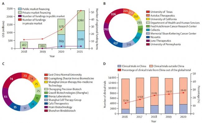 聚焦中國 CAR-T 細胞治療臨床試驗進展:截至 2021 年 11 月 15 日,國內(nèi)已注冊的相關臨床研究達 714 項。這其中,包含 510 項在 ClinicalTrials.gov 注冊的試驗,以及 204 項中國臨床試驗注冊試驗(詳見圖 1)。從地域分布來看,CAR-T 細胞治療的研究中心主要坐落于中國東部沿海經(jīng)濟城市。在臨床應用中,該療法在中國以治療血液系統(tǒng)惡性腫瘤為主,且在 B 系惡性腫瘤治療中應用最為廣泛;同時,中國研究團隊并未局限于惡性疾病領域,還主動探索 CAR-T 細胞治療在自身免疫性疾病、傳染性疾病、phems 綜合征等場景中的應用潛力。