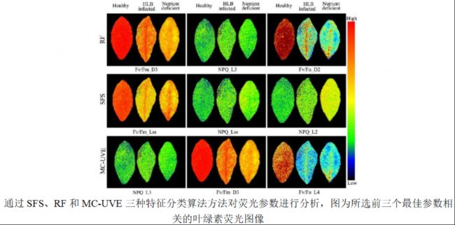 為深入解析HLB感染葉片的光合特征,本研究采用三種特征選擇方法結(jié)合監(jiān)督分類器進(jìn)行算法分析,成功識(shí)別出該病害特有的熒光信號(hào),并實(shí)現(xiàn)健康葉片、HLB感染葉片及營養(yǎng)缺乏葉片的精準(zhǔn)分類。