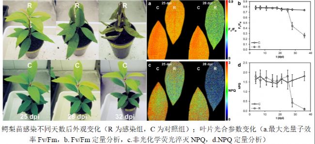 由真菌Rosellinia necatrix引起的白根腐病,是影響鱷梨作物的最主要的土壤傳播疾病之一。白根腐病會(huì)引起植物根系腐爛、葉片發(fā)黃枯萎,甚至導(dǎo)致植株在出現(xiàn)第一個(gè)葉面癥狀幾周后死亡。病害的早期檢測(cè)與防治至關(guān)重要。研究中利用葉綠素?zé)晒獬上駥?duì)感染Rosellinia necatrix后的植株進(jìn)行檢測(cè),光合參數(shù)結(jié)果表明,相比形態(tài)學(xué)性狀,鱷梨在遭遇白根腐病侵害后,光合在更早期便出現(xiàn)了變化,而葉綠素?zé)晒獬上窦夹g(shù)則靈敏檢測(cè)到了這種變化,這有助于在生產(chǎn)中幫助實(shí)現(xiàn)病害的“早發(fā)現(xiàn)早治療”。