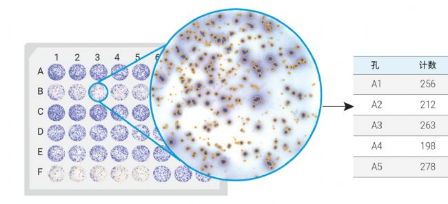 Cytation7 頂部成像 ELISpot 法計算分泌 IFNγ 的細(xì)胞數(shù)。