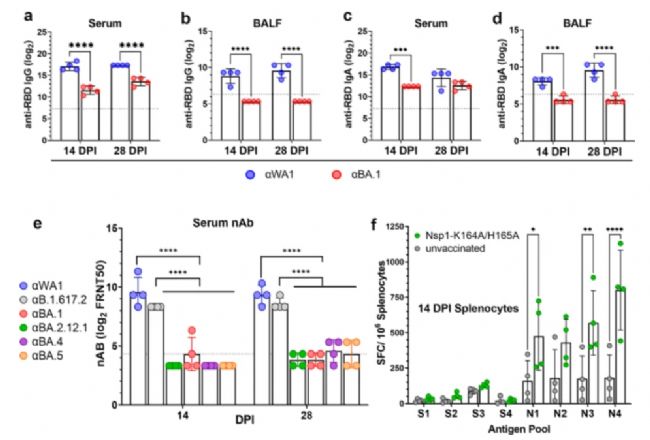 上圖:Nsp1-K164A/H165A 鼻內(nèi)免疫誘導(dǎo)粘膜和全身體液免疫和細(xì)胞免疫