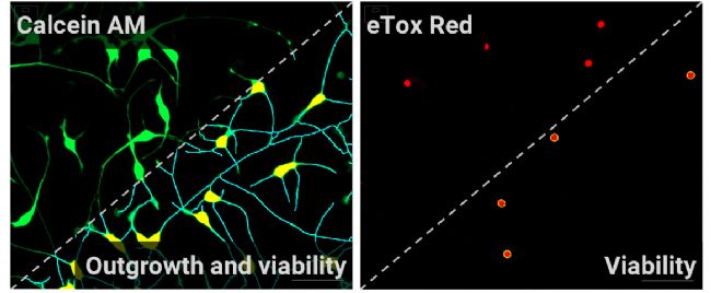 圖 2. 預實驗:熒光素 AM 方法用于細胞活力及神經(jīng)突生長檢測的驗證。