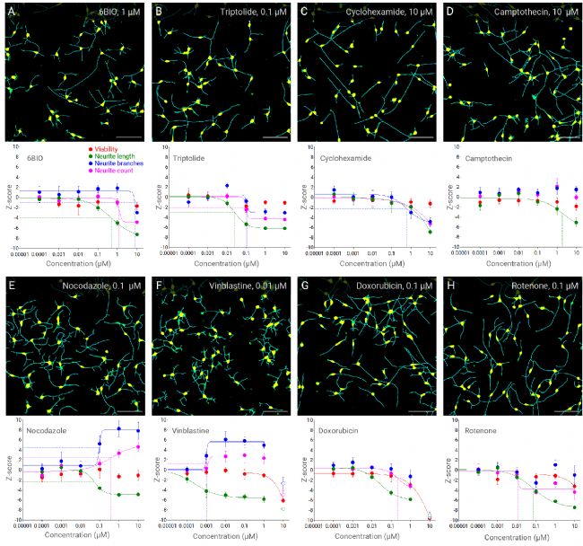 圖 4. 抑制神經(jīng)突生長的神經(jīng)毒性處理。A 至 H 上部為添加標記的細胞圖像:神經(jīng)元胞體(黃色)和神經(jīng)突骨架(青色)。A 至 H下部為每種處理的存活率和神經(jīng)元形態(tài)參數(shù)的劑量-反應分析,包括胞體計數(shù)(存活率,紅色)、神經(jīng)突長度(綠色)、神經(jīng)突分支(藍色)以及每個細胞的神經(jīng)突數(shù)量(神經(jīng)突計數(shù),粉色)