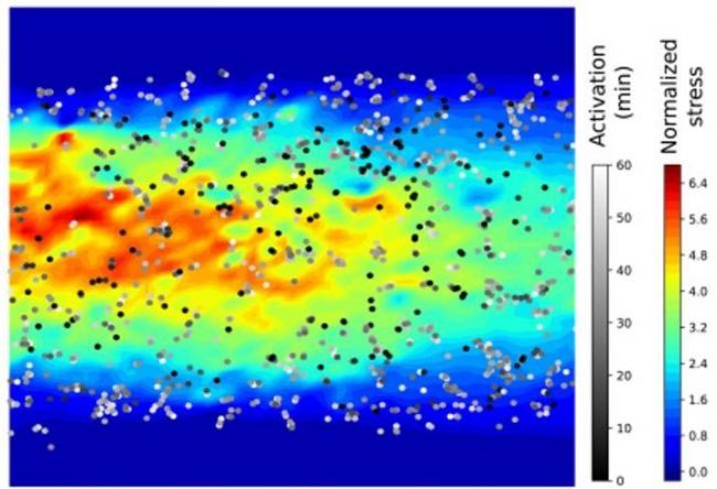 研究人員通過比較單個(gè)細(xì)菌中 TSAR 的激活速度,來探究局部機(jī)械應(yīng)力對(duì)福氏志賀菌的影響。為了實(shí)現(xiàn)這一目的,利用藍(lán)色膜探針 Pro12A 計(jì)算出組織的應(yīng)力圖譜,并將其與單個(gè)細(xì)菌的 TSAR 激活情況進(jìn)行對(duì)比。如圖 6 所示,研究人員觀察到,在上皮應(yīng)力較高的區(qū)域,細(xì)菌的激活時(shí)間明顯更早。