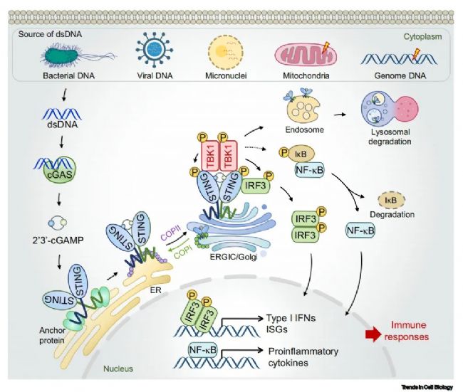 cGAS-STING激活常伴隨NF-κB信號活化。在ERGIC及高爾基體組裝的STING信號復合體可同時激活I(lǐng)RF3與NF-κB,協(xié)同誘導I型干擾素、干擾素刺激基因及多種促炎細胞因子的表達,在抗病毒、抗腫瘤及炎癥反應(yīng)中發(fā)揮關(guān)鍵作用。