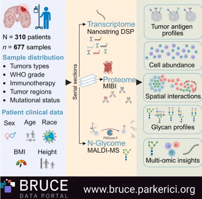 文章摘要:為揭示治療逃逸和腫瘤微環(huán)境(TME)景觀的特征,該研究對(duì) 310 名成人和兒童患者的 670 個(gè)病灶構(gòu)建了大型臨床注釋膠質(zhì)瘤隊(duì)列,整合空間蛋白組、轉(zhuǎn)錄組及糖組技術(shù)。通過單細(xì)胞空間成像解析腫瘤抗原和免疫受體表達(dá),并結(jié)合空間轉(zhuǎn)錄組及N-糖組圖譜,實(shí)現(xiàn)了分子特征、細(xì)胞組成與臨床信息的系統(tǒng)關(guān)聯(lián)。研究通過多組學(xué)分析揭示治療逃逸特征及腫瘤微環(huán)境動(dòng)態(tài)變化,發(fā)現(xiàn)靶抗原異質(zhì)性、復(fù)發(fā)相關(guān)免疫重塑及N-糖基化與腫瘤分級(jí)、免疫轉(zhuǎn)錄組與患者生存密切相關(guān),為膠質(zhì)瘤分型、預(yù)后評(píng)估及靶向治療提供了重要資源和分析框架。