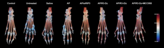 圖S50 CIA小鼠后爪偽彩顯微CT圖像:藍色對應低密度像素,指示骨質(zhì)侵蝕和軟骨損傷的區(qū)域,紅色對應高密度像素,指示高密度骨質(zhì)區(qū)域。