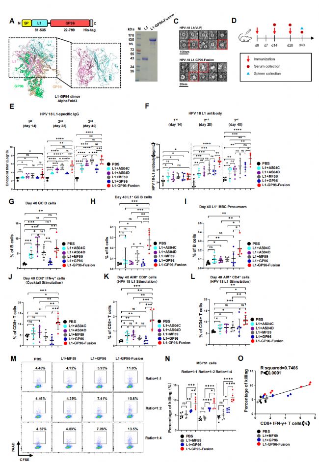 1. L1疫苗:L1-GP96-Fusion在誘導(dǎo)中和抗體滴度上與經(jīng)典佐劑(AS04, MF59)相當(dāng)或更優(yōu),且顯著增強(qiáng)了Th1型的IgG2a反應(yīng)和GC B細(xì)胞應(yīng)答(圖6E-I)。更重要的是,它誘導(dǎo)的CD8+ T細(xì)胞應(yīng)答更強(qiáng),在體外能更有效地殺傷HPV感染的細(xì)胞系,且殺傷效力與CD8+ IFN-γ+ T細(xì)胞頻率正相關(guān)(圖6J-O)。
