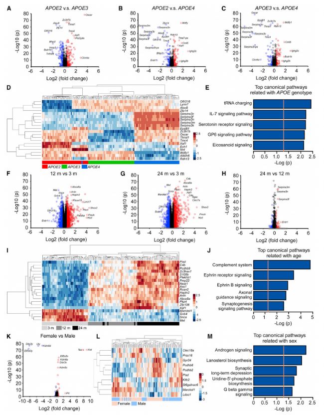 在1,813個(gè)基因中觀察三個(gè)APOE基因型之間的差異表達(dá)。受APOE基因型影響的DEGS顯著富集于白細(xì)胞介素-7(IL-7)信號(hào)、5-羥色胺受體信號(hào)、GP6信號(hào)和eicosanoid信號(hào)通路(圖3E)。在12個(gè)月與3個(gè)月,或24個(gè)月與3個(gè)月之間,約有3000個(gè)DEGS被發(fā)現(xiàn),而24個(gè)月至12個(gè)月之間的DEGS數(shù)量低于500,這表明大腦轉(zhuǎn)錄的最顯著變化出現(xiàn)在3至12個(gè)月的年齡(圖 3F-3H)。受年齡影響的DEGS在Ephrin受體信號(hào)等途徑中顯著富集(圖3J)。與性別相關(guān)的DEGS在雄激素信號(hào)、拉諾醇生物合成和突觸長(zhǎng)期抑制等途徑中顯著富集(圖3M)。前10位DEGS的分層聚類(lèi)沒(méi)有成功地根據(jù)性別分離樣本(圖3L),表明這些基因也可能受到年齡或APOE基因型等其他因素的調(diào)控。
