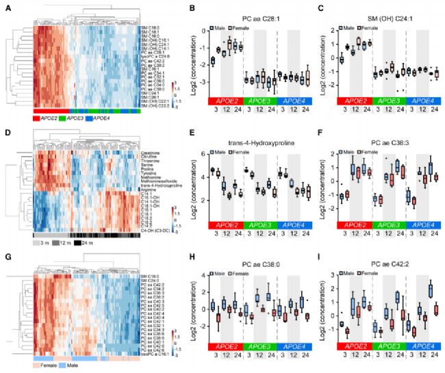 在三種APOE基因型中共篩選出130個(gè)DEM。(圖5A-5C)。在對(duì)年齡的研究中,前20個(gè)DEM的層次聚類(lèi)成功地將3個(gè)月的血清樣本與12個(gè)月和24個(gè)月的血清樣本分離,主要是氨基酸和生物胺的下調(diào)和3個(gè)月后;鈮A的上調(diào)(圖5H-5K)。在對(duì)性別的研究中,前20個(gè)DEM都是脂類(lèi),但這些DEM的層次聚類(lèi)并沒(méi)有明確區(qū)分性別。