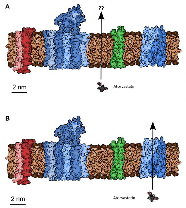 圖示大致按比例繪制的典型生物膜結(jié)構(gòu),表明典型的蛋白質(zhì):脂質(zhì)質(zhì)量比,以及小分子藥物(阿托伐他汀,也按比例繪制)可能通過(guò)的方式,包括(A)雙層脂質(zhì)擴(kuò)散,通過(guò)名義上不受蛋白質(zhì)存在影響的雙層區(qū)域,或者(B)通過(guò)轉(zhuǎn)運(yùn)體來(lái)實(shí)現(xiàn)中間代謝。(圖來(lái)源:Front Pharmacol. 2014 Oct 31;5:231.)