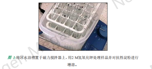 i. 向每個試管中加入 2 mL 2 M 氫氧化鉀,并將磁力攪拌子(5×15mm)放入試管。將試管置于冰水中,在磁力攪拌器上攪拌約 20 分鐘,使顆粒重懸(并溶解抗性淀粉)(圖 1,第 10 頁)。