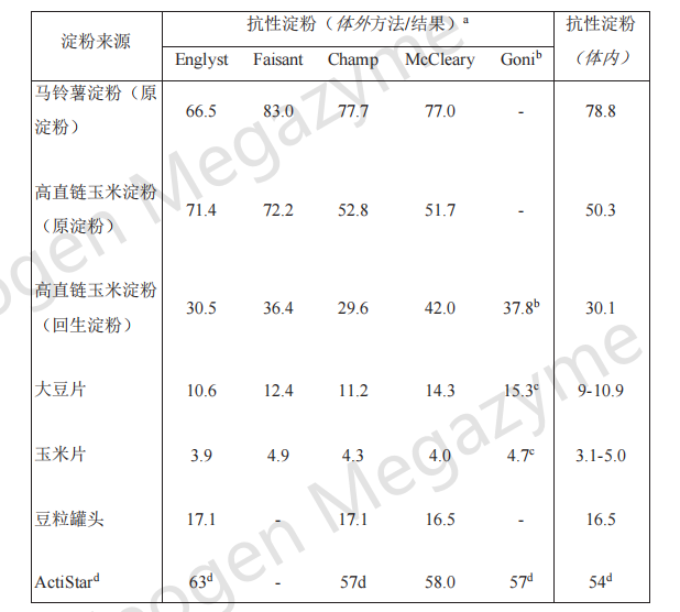 a 數(shù)值表示抗性淀粉占樣品總淀粉含量的百分比。除 McCleary、Goni 等人(10)的數(shù)據(jù)以及 ActiStarR 的數(shù)值外,所有數(shù)據(jù)均來自 Champ 等人(16)。
