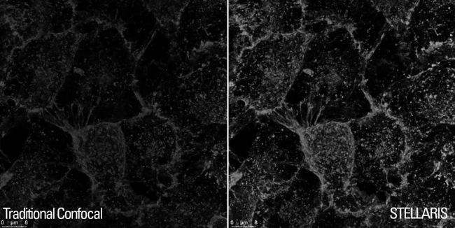 用WGA-CF488染料標記的海拉細胞。 左: 傳統的光子計數結果;右: Power Counting的結果。 圖中為Z-stack的最大強度投影,用12kHz共振掃描儀獲得,用LIGHTNING處理Power HyD S探測器是STELLARIS的新核心部分。這些硅基多像素光子計數器(MPPC)探測器是徠卡顯微系統多年工程設計經驗的成果。這一增強的圖像質量樹立起共聚焦成像新標準。