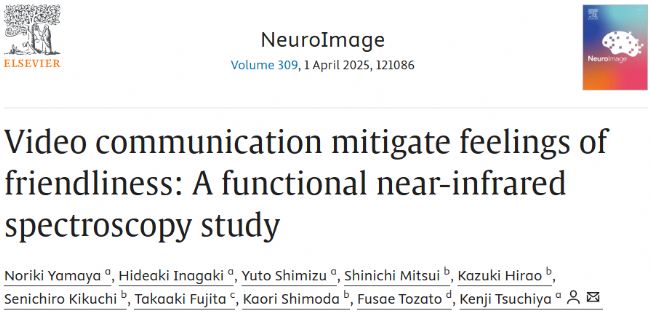 Yamaya, N., Inagaki, H., Shimizu, Y., Mitsui, S., Hirao, K., Kikuchi, S., Fujita, T., Shimoda, K., Tozato, F., & Tsuchiya, K. (2025). Video communication mitigate feelings of friendliness: A functional near-infrared spectroscopy study. NeuroImage, 309, 121086.