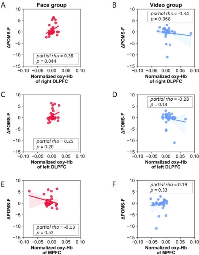 圖3. 面對(duì)面交流組(Face組)和視頻交流組(Video組)在各腦區(qū)的氧合血紅蛋白均值與友好情感變化值(ΔPOMS-F)的關(guān)系。注:A. Face組右側(cè)背外側(cè)前額葉皮層(DLPFC)血氧水平與ΔPOMS-F的關(guān)系;B. Video組右側(cè)DLPFC血氧水平與ΔPOMS-F的關(guān)系;C. Face組左側(cè)DLPFC血氧水平與ΔPOMS-F的關(guān)系;D. Video組左側(cè)DLPFC血氧水平與ΔPOMS-F的關(guān)系;E. Face組內(nèi)側(cè)前額葉皮層(MPFC)血氧水平與ΔPOMS-F的關(guān)系;F. Video組MPFC血氧水平與ΔPOMS-F的關(guān)系。偏Spearman等級(jí)相關(guān)分析顯示,F(xiàn)ace組右側(cè)DLPFC活動(dòng)與主觀友好情感呈顯著正相關(guān)(p < 0.05),而Video組呈邊緣顯著負(fù)相關(guān)(p = 0.068)。在Face組和Video組中,左側(cè)DLPFC活動(dòng)與主觀友好情感均無(wú)顯著相關(guān)性。兩組MPFC活動(dòng)與主觀友好情感亦無(wú)顯著相關(guān)性。圖中圓點(diǎn)代表個(gè)體參與者數(shù)據(jù),陰影區(qū)域表示95%置信區(qū)間