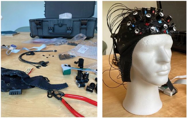圖3. 近紅外研討會(huì)的現(xiàn)場照片。左圖:人們正在學(xué)習(xí)如何裝配和使用fNIRS設(shè)備;右圖:裝置完成后的設(shè)備
