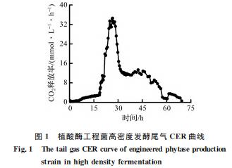 在山東省科學 院 生 物 研 究 所 承 擔 的“植 酸 酶 工 程菌高密度發(fā)酵智能控制關(guān)鍵技術(shù)”(山東省重點研 發(fā)計劃項目 2016ZDJS07A20) 項 目 中,在 10L 實 驗 室發(fā)酵罐上,采用 FGA 發(fā) 酵 尾 氣 分 析 儀,對 重 組 畢 赤酵母表達植酸酶過程進行實時在線檢測 。 發(fā)酵溫 度 30 ℃,初 始 發(fā) 酵 液 體 積 7L,通 氣 量 5L/min,攪拌轉(zhuǎn)速 200r/min 。 發(fā)酵 6h5min 時,CER 開 始 緩 慢上升;發(fā) 酵 25h26 min 時,CER 出 現(xiàn) 快 速 上 升, 曲線上形成明顯的 臨 界 點,預(yù)示發(fā) 酵進入對數(shù)生長 期,此時 立刻調(diào)整攪拌轉(zhuǎn)速至 400r/min;之 后 隨 著 CER 的上升,階段性小步調(diào)整攪拌轉(zhuǎn)速達 530r/min, 并保持至 發(fā) 酵 48h30 min,之 后調(diào)整攪拌轉(zhuǎn)速至 500r/min,直至 發(fā) 酵 結(jié) 束 。 該 發(fā) 酵 過 程 的 CER 變 化曲線如圖 1 所示 。在該過程中,發(fā) 酵 15h 時 進 行 甲醇誘導,誘 導 5h 后 開 啟 蛋 白 表 達,SDS-PAGE 檢 測植酸酶表達見文獻[18],最終酶活達 3 000U/mL。