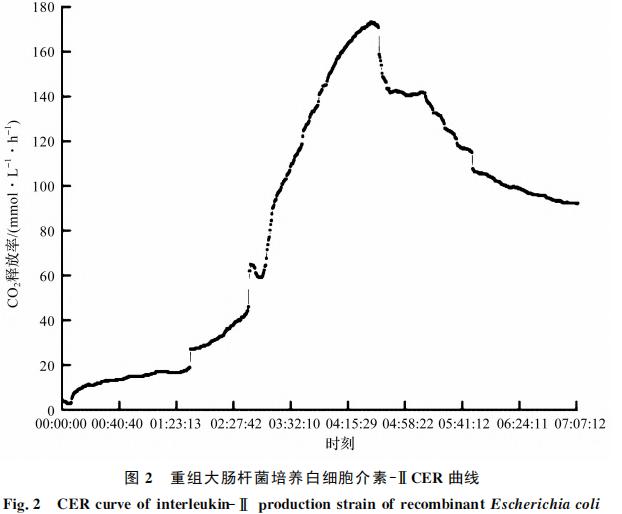 應(yīng) 用 發(fā) 酵 尾 氣 分 析 技 術(shù),可 以 直 觀 地 辨 識 菌 體 生長的各個階 段 。 一般在對 數(shù)生長期的后期,即 培 養(yǎng)基中葡萄糖剛剛 耗 盡,細胞濃度增加緩慢或略有 下降時,尾氣分析的 CER 曲線會出現(xiàn)一個由上升轉(zhuǎn) 為下降的臨界點,利用該臨界點可 以方便地確定誘 導時機,及時進行乳糖誘導 。