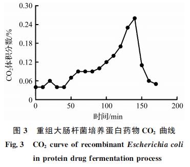 在廣東某高校進行的重組大腸桿菌發(fā)酵 藥 物 蛋 白實驗中,發(fā)酵開始后,經(jīng)過短暫的遲緩期,CO2 曲線 開始緩慢上 升,約 2h 后 發(fā) 酵 快 速 進 入 對 數(shù) 生 長 期; 20min后,CO2 曲 線 突 然 出 現(xiàn) 了 下 折,CO2 體積分數(shù) 迅速下降,在不到 30min 的時間內(nèi)下降到接種前水平, 鏡檢觀察,發(fā)現(xiàn)此時發(fā)酵液中的工程菌已經(jīng)消失,判斷 感染了噬菌體,隨即停止發(fā)酵,并迅速進行滅菌處理。 該實驗過程的 CO2 體積分數(shù)變化曲線如圖 3 所示。