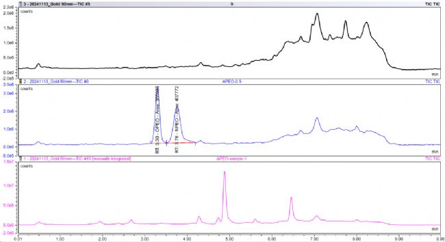 (上圖:溶劑空白;中圖:APnEO混合標(biāo)準(zhǔn)溶液,濃度為0.5 μg/mL;下圖:樣品溶液)