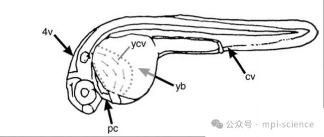 最常用的注射部位是尾靜脈(cv)。其他有用的注射部位包括大腦的第四腦室(4v)、心包(pc)和卵球(yb)。