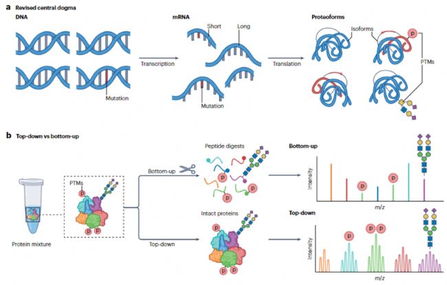 中心法則描述了信息從 DNA 流向mRNA,最終轉(zhuǎn)化為執(zhí)行生物學(xué)功能的蛋白質(zhì)的過程。大量的 proteoforms 形成了化學(xué)性質(zhì)多樣的蛋白質(zhì)家族。proteoforms 的產(chǎn)生源于翻譯后修飾(PTMs)、RNA 可變剪接以及遺傳變異(圖 1a)。因此,