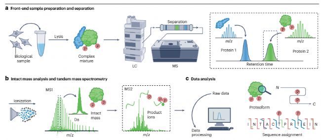 自上而下方法需要三個主要步驟(圖 2):電離(從目標(biāo)蛋白質(zhì)產(chǎn)生可在質(zhì)譜儀中傳輸?shù)臍庀嚯x子)、通過 MS1 對電離蛋白質(zhì)進(jìn)行完整質(zhì)量分析、完整氣相碎裂以產(chǎn)生序列信息產(chǎn)物離子(通過 MS2);以及數(shù)據(jù)處理(包括數(shù)據(jù)庫搜索),用于 proteoforms 的鑒定、表征和定量。