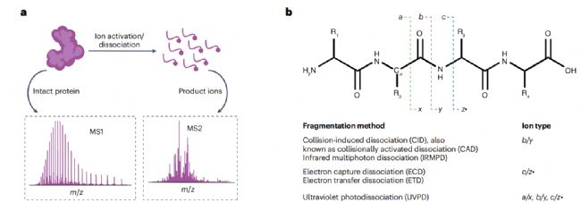 在 TDP 中,MS/MS 通常包括以下步驟:通過 MS1 分析完整蛋白質(zhì),選擇前體蛋白離子,將其碎裂為更小的碎片離子,然后分析碎片離子以推導(dǎo)蛋白質(zhì)的一級結(jié)構(gòu)和修飾(圖3a)。有多種活化/解離方法可用于產(chǎn)生產(chǎn)物離子(圖 3b)。大多數(shù)儀器能進(jìn)行碰撞誘導(dǎo)解離(CID),通過與中性氣體分子(如氮氣或氬氣)相互作用產(chǎn)生的碰撞活化,生成b/y離子。紅外多光子解離(IRMPD)涉及低能紅外光子的吸收,可產(chǎn)生b/y離子;當(dāng)吸收多個光子時,可能產(chǎn)生次級及更高階的碎片離子,從而提供更豐富的蛋白質(zhì)序列信息;陔娮拥慕怆x方法(ExD),如電子捕獲解離(ECD)和電子轉(zhuǎn)移解離(ETD),在產(chǎn)生高序列覆蓋率方面通常優(yōu)于 CID。ExD 會產(chǎn)生c/z離子,可用于可靠的proteoforms 表征和翻譯后修飾定位。使用 193 nm 或 213 nm 激光,紫外光解離(UVPD)會產(chǎn)生更復(fù)雜的串聯(lián)質(zhì)譜圖,其序列覆蓋率與 ExD 方法相當(dāng)或更高。