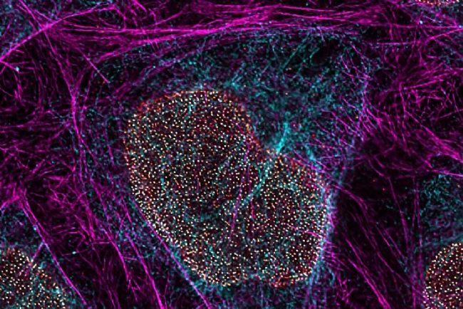用于細(xì)胞生物學(xué)應(yīng)用的多彩 TauSTED Xtend 775,要求對(duì)多個(gè)細(xì)胞組分進(jìn)行納米級(jí)分辨率成像。細(xì)胞顯示出波形蛋白纖維(AF 594)、肌動(dòng)蛋白網(wǎng)絡(luò)(ATTO 647N)和核孔籃(CF 680R)。樣本由布里吉特·貝爾格納、馬里亞諾·岡薩雷斯·皮斯菲爾、斯特芬·迪特策爾提供,生物醫(yī)學(xué)中心生物成像核心設(shè)施,路德維希-馬克西米利安大學(xué),德國(guó)慕尼黑。
