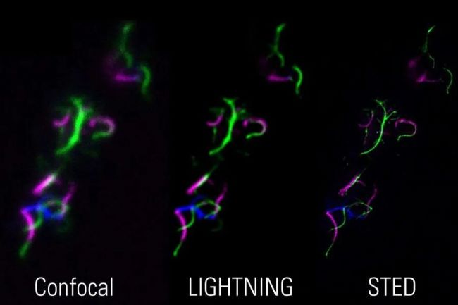細(xì)菌鞭毛的圖像:相關(guān)的三色共聚焦-LIGHTNING-STED 成像允許同時(shí)使用互補(bǔ)的方法來(lái)研究和驗(yàn)證樣本。樣本由德國(guó)柏林洪堡大學(xué)的 Marc Erhardt 提供。
