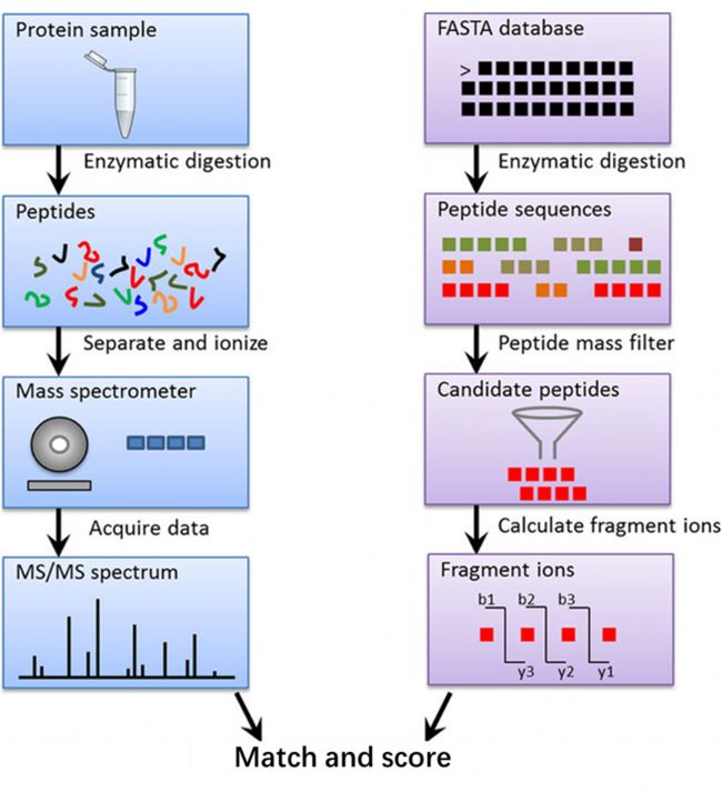 圖2 數(shù)據(jù)庫搜索基本原理示意(Picture Ref.: Jimmy K. Eng,et.al.,2011,MCP)