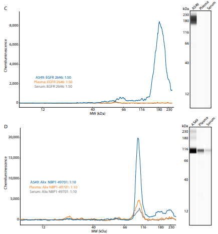 圖 1 利用Simple Western™測外泌體目標(biāo)抗原。A:flotillin-1;B:Annexin V;C:EGFR;D:Alix。
