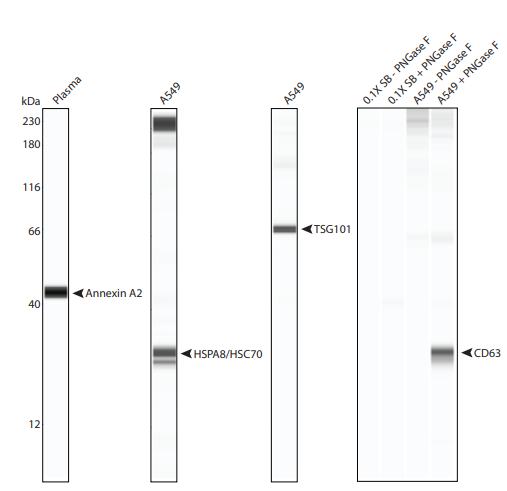 由于外泌體體積微小,從復(fù)雜的生物基質(zhì)中分離外泌體頗具挑戰(zhàn)性,且分離產(chǎn)量通常較低。在此背景下,Simple Western™成為研究外泌體的理想技術(shù):該方法僅需 3 微升樣品,且具備皮克級靈敏度,大幅減少了傳統(tǒng)Western blot對所需外泌體量的要求。隨后,可使用針對外泌體相關(guān)抗原的特異性檢測抗體對之進行表征分析 —— 這些目標(biāo)抗原既可以是外泌體的通用標(biāo)志物,也可以是其來源細胞或體液所特有的標(biāo)志物。本實驗方案中,我們將利用市售的外泌體標(biāo)準(zhǔn)品和抗體,通過Simple Western™檢測外泌體的通用標(biāo)志物和來源特異性標(biāo)志物。